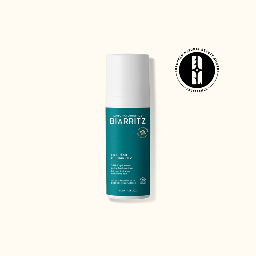 Angereichert mit natürlich vorkommender Hyaluronsäure und einem patentierten Rotalgenextrakt von der baskischen Küste mit antioxidativer Wirkung, bietet die Crème de Biarritz 24 Stunden lang kontinuierliche¹ Feuchtigkeitsversorgung und hilft, ersten Falten vorzubeugen. Garantiertes Eintauchen für eine intensiv mit Feuchtigkeit versorgte, aufgepolsterte und strahlende Haut.